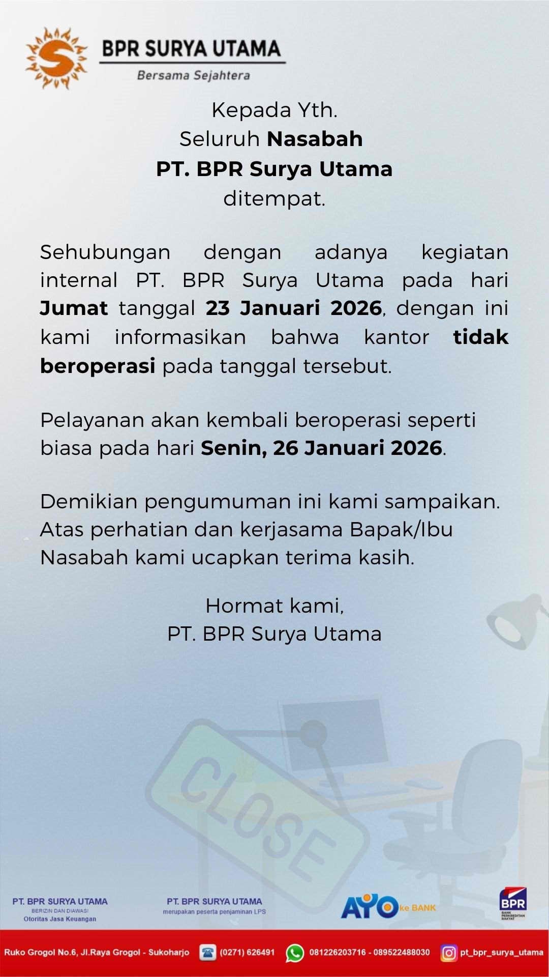 Jangan ragu untuk berdiskusi langsung dengan tim profesional kami. BPR Surya Utama siap mendampingi langkah Anda menuju kesuksesan finansial.